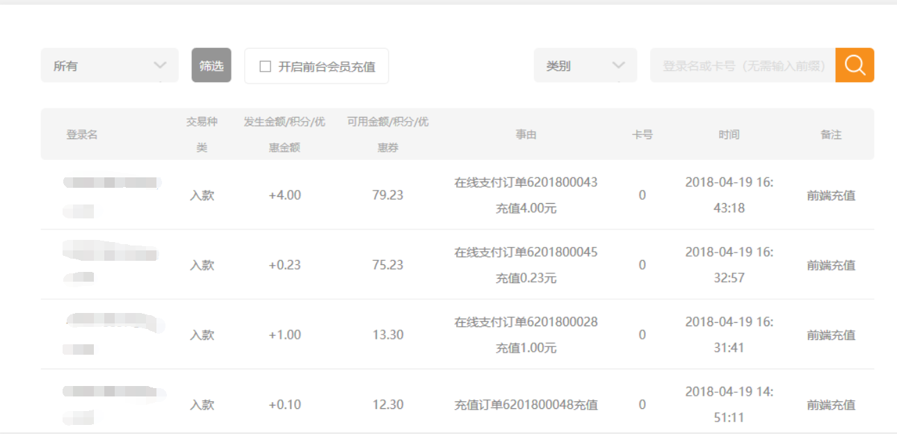 ⑦.在后台会员交易中,可以看到所有支付成功的订单(后台充值和前台充值),为了区分订单,在事由中有描述,如下图: